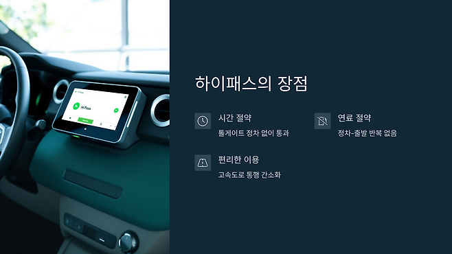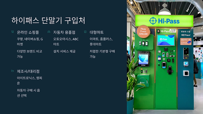 장점: 신차 구매 시 하이패스 단말기를 옵션으로 선택하거나, 출고 후 대리점에서 구매 및 설치 서비스를 받을 수 있습니다.