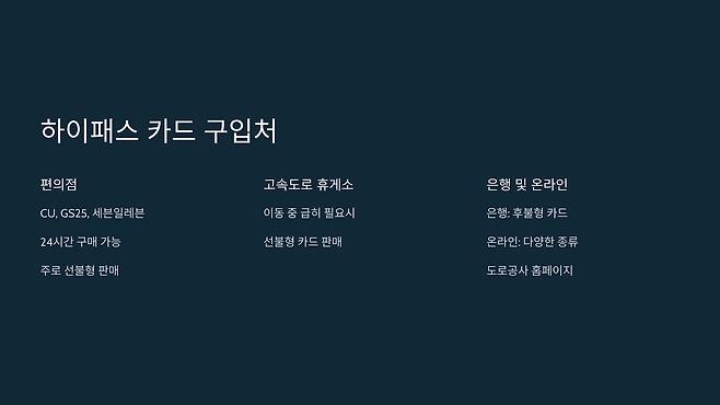 구입 가능한 카드: 대부분 선불형 하이패스 카드를 판매합니다. 일부 편의점에서는 후불형 하이패스 카드 발급을 대행하기도 합니다.