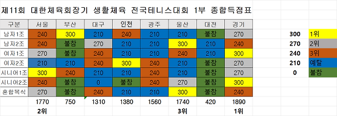 1부와 2부에서 우승을 한 경기도와 경상북도는 총점 1,890점으로 동점을 이루었다.