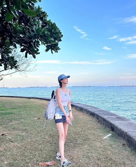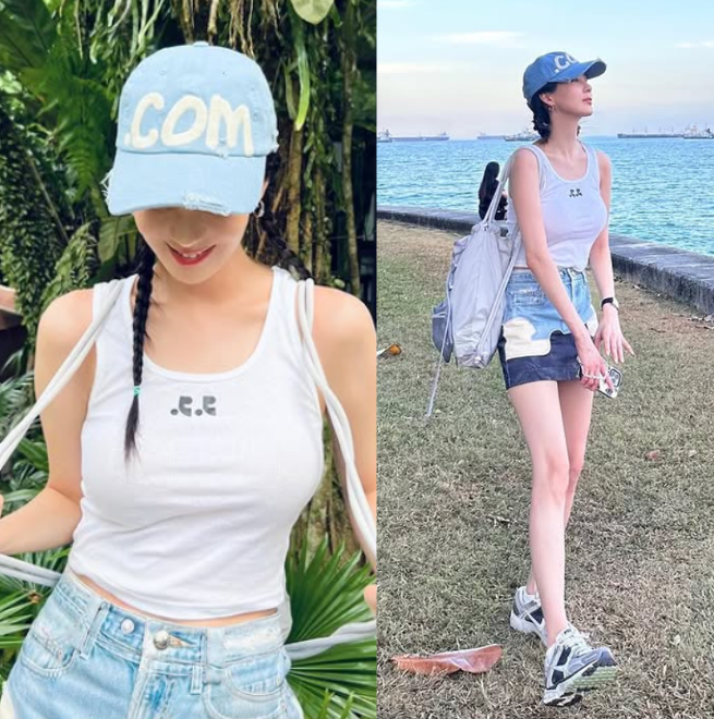 서현의 여름룩은 베이식한 화이트 나시티로 시작했어요. 군더더기 없이 심플한 디자인 덕분에 전체적으로 시원하고 깔끔한 인상을 주었고, 데님 아이템들과도 자연스럽게 조화를 이루며 밸런스를 맞췄답니다.