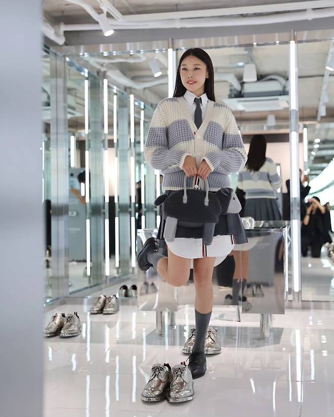 한혜진은 이번 착장에서 클래식한 프레피 룩에 위트 있는 포인트 아이템을 더해, 군더더기 없는 도회적인 스쿨룩을 완성했습니다.