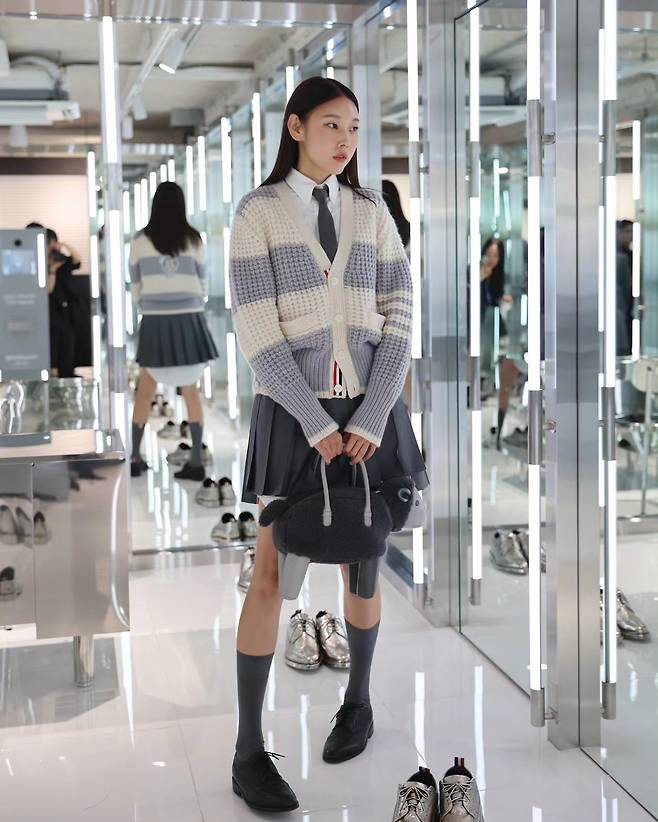 특히 딥한 컬러 안에서 대비되는 양 모양의 퍼 클러치백은 이 스타일링이 단순한 '스쿨 룩'에 머물지 않게 해주는 결정적인 장치입니다.