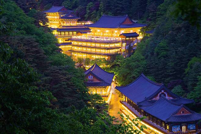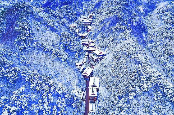 겨울 풍경은 흰 눈으로 덮인 전각들과 고즈넉한 산세가 어우러져 장관을 이룹니다.