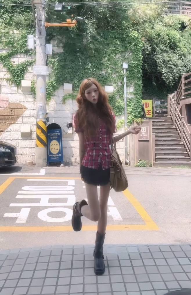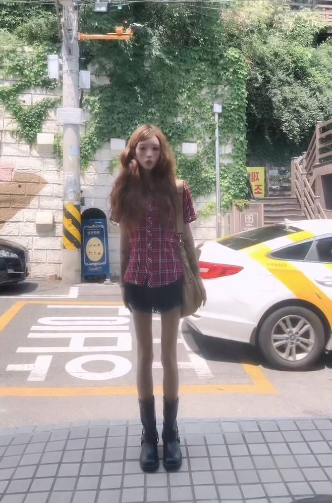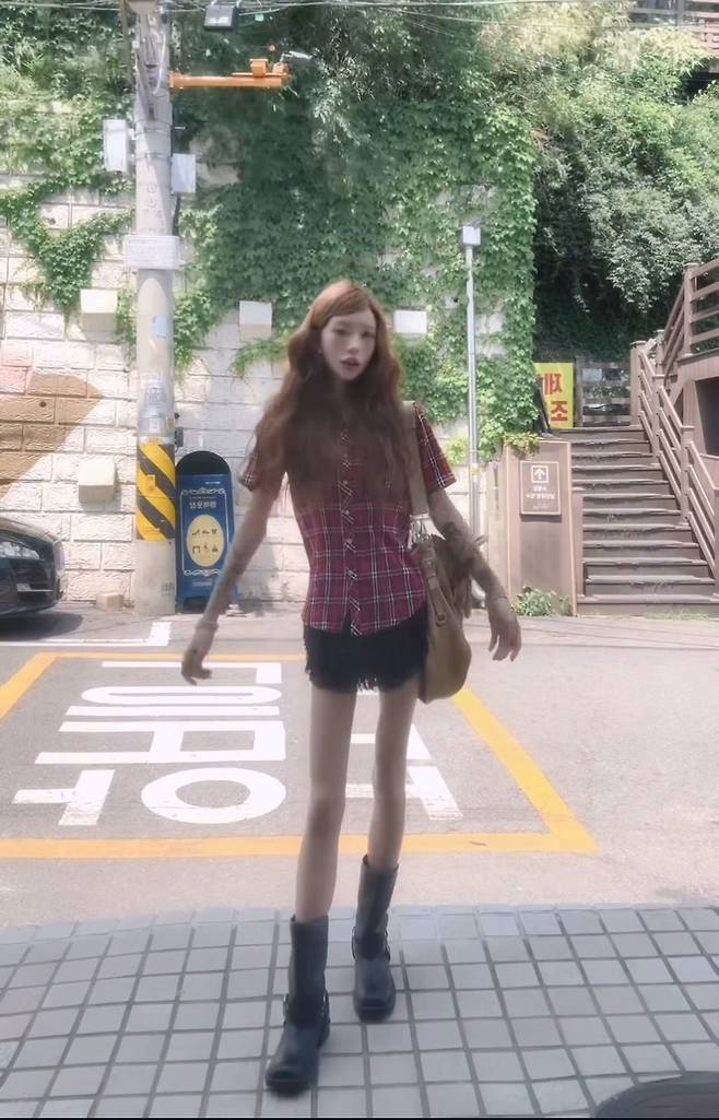 최준희는 타이트하게 핏되는 레드 체크 셔츠에 레이스 미니 쇼츠를 매치해 레트로한 무드를 강조했습니다.