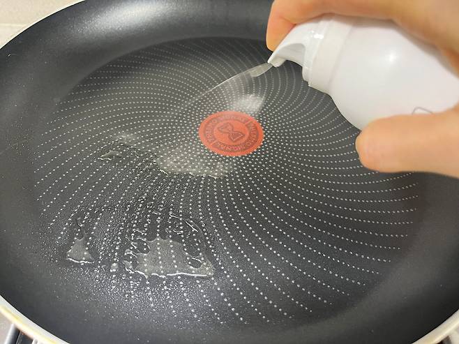 팬에 기름을 두르고 예열합니다. 생선 구울 때는 일반 식용유보다 올리브유나 아보카도유 등 좋은 식물성 기름을 쓰면 향도, 맛도 더욱 좋아집니다. 기름을 두르고 강불로 올려서 약 30초 예열하세요.