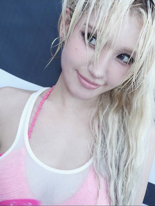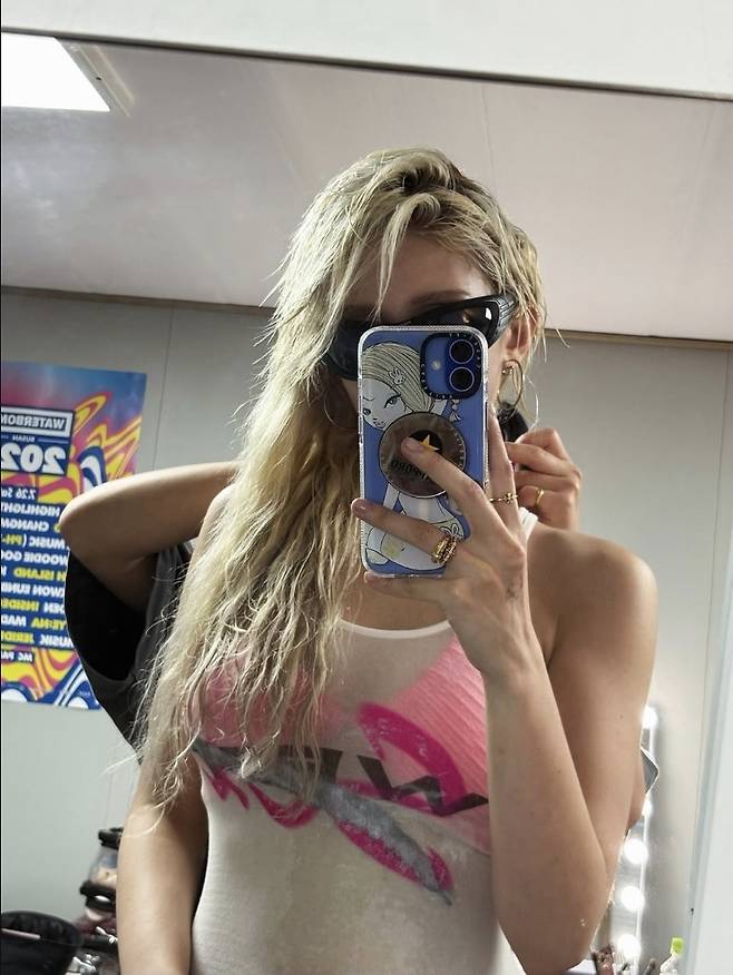 자연스럽게 젖은 듯한 블론드 헤어는 Y2K 감성의 정수를 보여줬고, 데님 쇼츠와의 조합은 스트리트 무드를 완성했습니다.