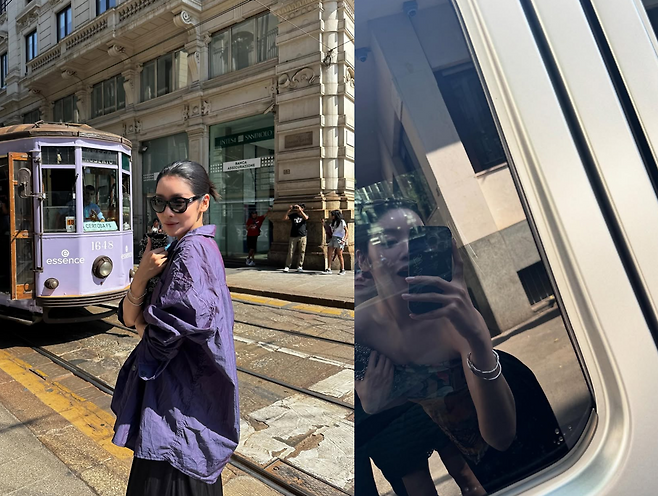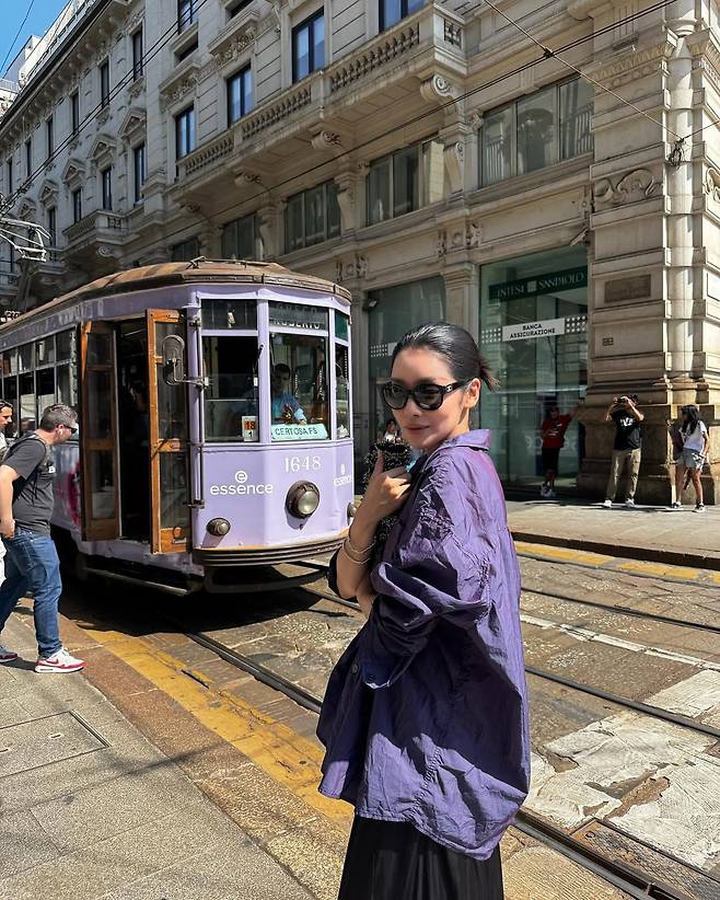 라벤더빛 오버핏 셔츠를 걸치고 전차가 지나는 클래식한 밀라노 거리 한가운데 서 있는 모습은 그 자체로 도시의 한 장면이자 화보였다.