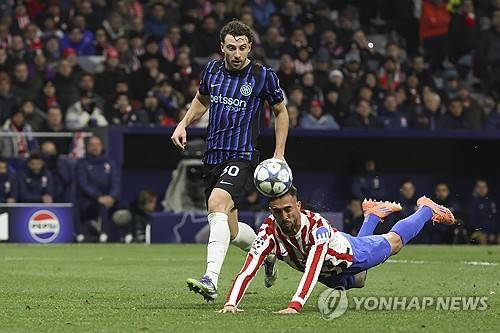 epa12551400 Atletico Madrid's Nico Gonzalez (R) in action against Inter's Carlos Augusto (L) during the UEFA Champions League match between Atletico Madrid and Inter Milan at the Metropolitano stadium in Madrid, Spain, 26 November 2025. EPA/Kiko Huesca