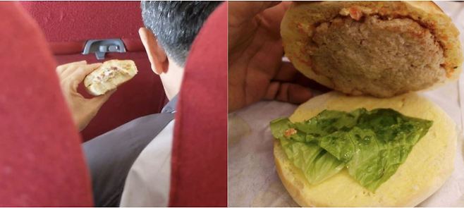 고려 항공의 햄버거는 포장이 잘 되어 있지만, 포장을 풀면 금새 어설픈 모양이 드러나는데요. 빵 안에는 고기 패티와 슬라이스 치즈, 양상추 조각, 갈색 소스가 들어있습니다. 허접한 야채들을 걷어내면 어떤 종류의 고기로 만든 건지 모르겠는 고기 패티가 드러나는데요. 이는 소고기향이 나면서 닭고기 맛이 난다고 하죠.
