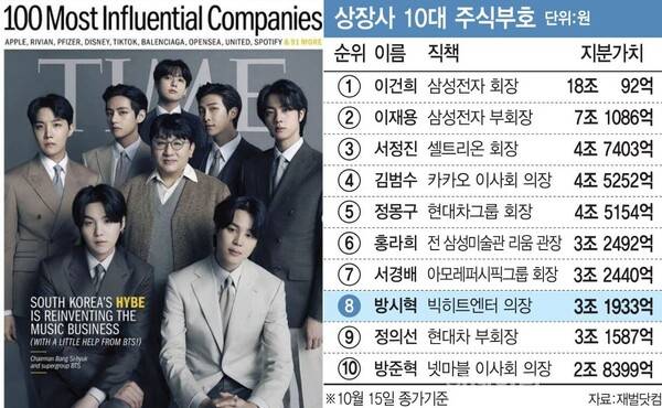 이에 방시혁이 의장으로 있는 하이브는 미국 타임지가 선정한 '가장 영향력 있는 100대 기업'에 오르는가 하면, 코스피 공식 상장 후 방시혁은 주식 부자 8위에 이름을 올리는 모습을 보이기도 했습니다.