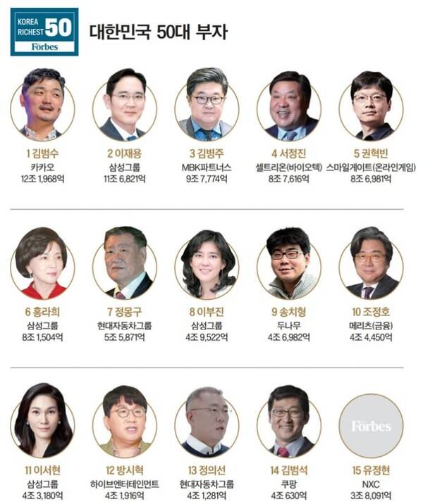 2024년에는 과거보다 재산 가치가 더 올라 최태원 SK그룹 회장(8위)과 구광모 LG그룹 회장(10위)보다 높은 6위를 차지한 것으로 알려졌습니다.