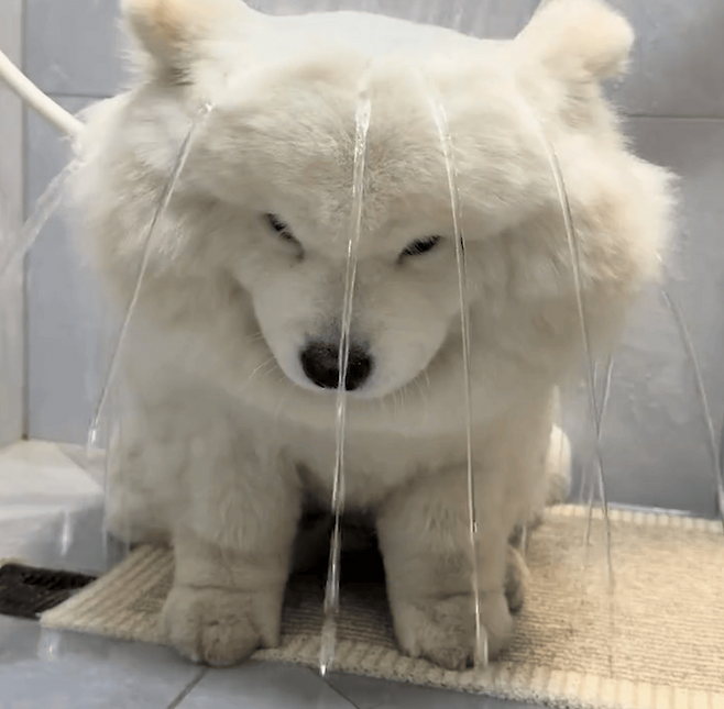 신나서 샤워기를 틀자 졸졸 흐르는 물줄기가 강아지 머리 위로 쏟아졌습니다. 강아지의 털은 마치 두꺼운 담요처럼 풍성했는데, 물줄기가 닿자마자 마법처럼 여섯 갈래로 흩어졌습니다.