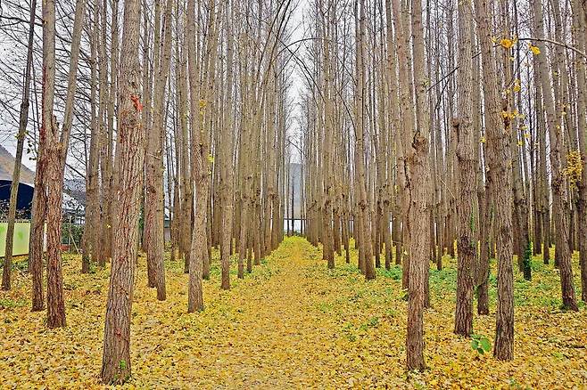 묘목장 특성상 나무들이 일렬·정렬 형태로 심어져 있었고, 이 덕분에 수직으로 뻗은 은행나무들이 마치 자작나무숲처럼 곧게 솟아올라 환상적인 숲길을 연출해요. 이러한 배치는 단순히 나무가 많아 아름답다기보다는, 위에서 아래로 뻗은 황금빛 터널이라는 시각적 인상을 만들어내죠.