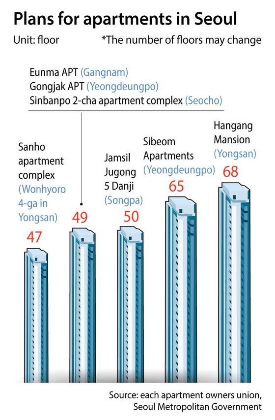 “We will determine the height of the apartment buildings considering the characteristics of the neighborhood,” said a Seoul government official. “It would be difficult to allow 50 stories high or taller apartments if the surrounding residential buildings are low rises or if the newly built apartments hurt the surrounding view.”