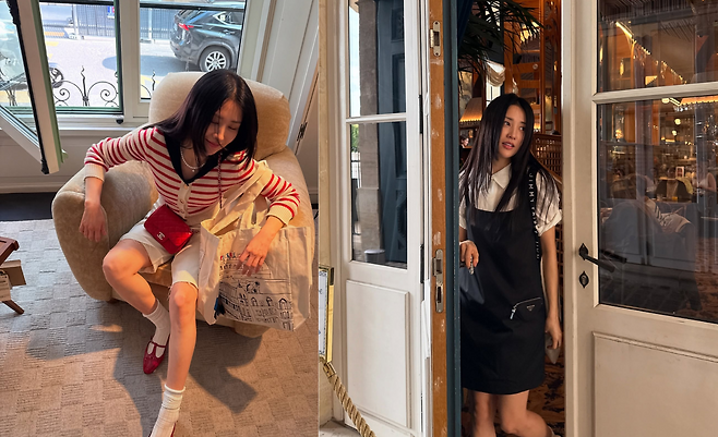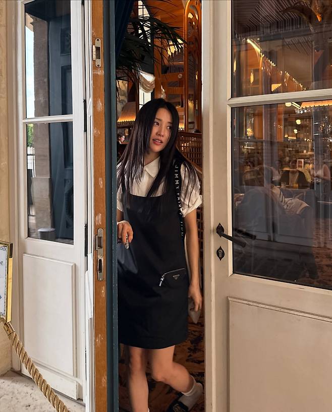 블랙 서스펜더 스타일의 미니 원피스 안에 화이트 티셔츠를 레이어드해 모던하면서도 캐주얼한 매력을 발산하고 있다. 체인백과 베이지 톤의 샌들로 마무리해 카페나 일상에서도 세련됨을 잃지 않는 룩을 선보이고 있다.