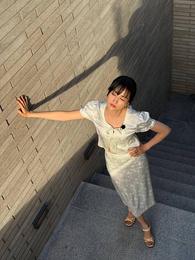 화이트 컬러의 셔츠와 플로럴 패턴 스커트로 구성된 세트업으로 청순하면서도 여성스러운 매력을 강조하고 있다. 골드 톤의 스트랩 샌들과 함께 여름철 완벽한 원톤 코디네이션을 완성해 단아한 아름다움을 표현하고 있다.