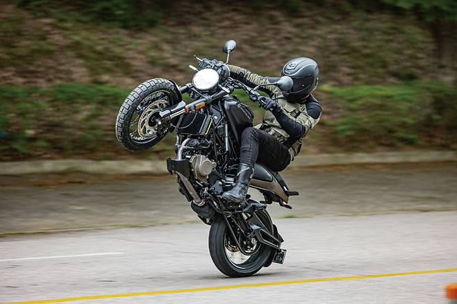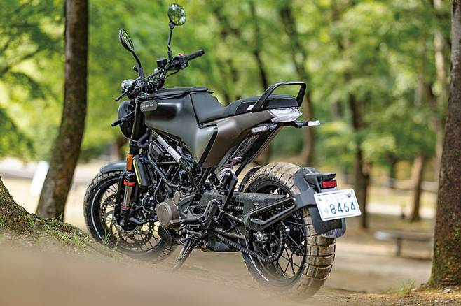 이렇게 완성도 높은 디자인에 다소 귀여운 엔진이 장착됐다. 125cc 단기통 엔진은 6단 미션과 맞물려 최고출력 15마력을 발휘한다. 사실 동일한 차체를 사용하는 스바르트필렌401이 44마력을 내는 373cc 단기통 엔진을 탑재하기 때문에 작게 느껴지는 것이지, 125cc 클래스에서는 최고 수준의 강력함이다. 브레이크 역시 상위 모델과 동일한 바이브레캘리퍼가 장착되고 보쉬의 2채널 ABS가 적용됐다. 워낙 다른 모델에서 오랜 기간 사용되면서 그 성능을 입증 받았기때문에 믿음이 간다. 전후 17인치 와이어 스포크 휠에는 피렐리 스콜피온 랠리 STR 타이어가 순정으로 장착되었고 WP APEX 서스펜션이 조합되어 늠름한 오프로드 주행도 짐작할 수 있다.