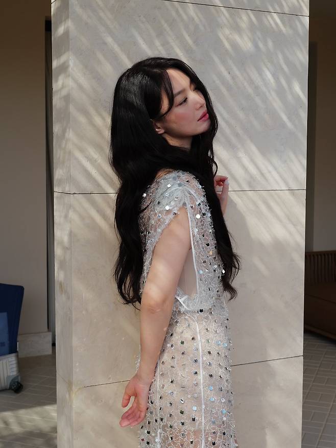 어깨를 살짝 드러낸 디자인은 여리한 실루엣을 강조했고, 허벅지까지 깊게 들어간 슬릿은 그녀의 시그니처인 우아함과 강인함을 동시에 보여줬어요.
