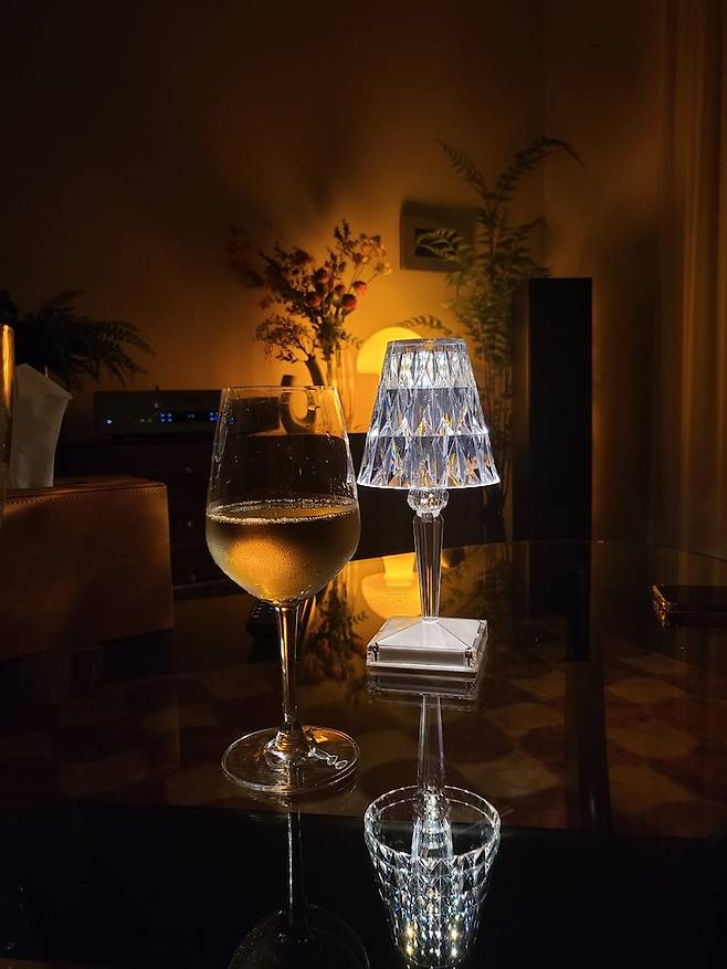 저희 거실은 밤에 더욱 빛나는 공간이랍니다. 저는 저녁에 거실에서 불 꺼놓고 넷플릭스 다큐를 보면서 와인을 마시는 게 너무 힐링 되더라고요! TV가 없는 대신 스탠바이미를 쓰고 있는데 이동이 편리해서 와인 마실 때나 부엌에서 요리를 할 때나 언제든 앞에 두고 보고 싶은 영상을 볼 수 있어서 너무 좋아요!