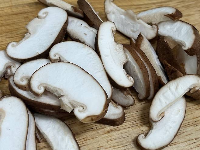 표고버섯은 너무 얇지 않게, 약 0.5cm의 두께로 썰어 주세요. 버섯을 균일한 두께로 써는 것이 좋아요.