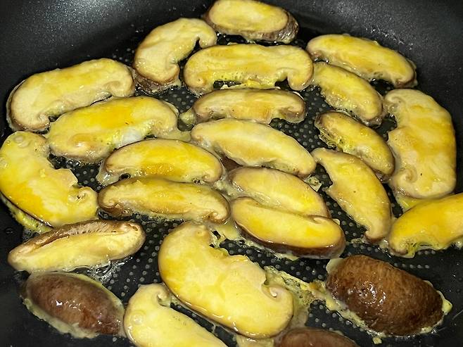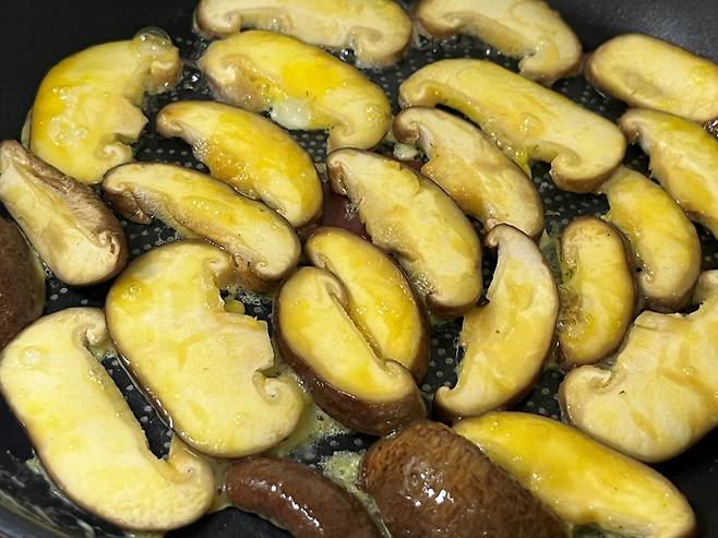 팬에 기름을 두르고 버섯을 고르게 올려놓으세요. 최대한 겹치지 않도록 펼쳐서 둡니다. 그래야 골고루 맛있게 익습니다.