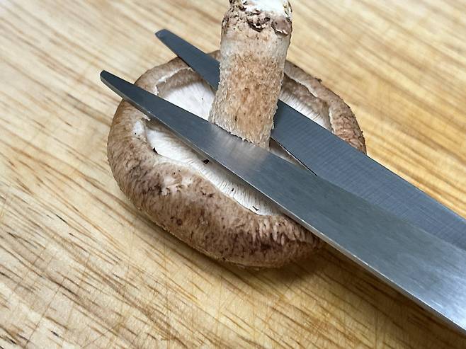 표고버섯기둥은 가위로 잘라서 제거합니다. 제거한 기둥은 나중에 육수를 낼 때 활용해 보세요.