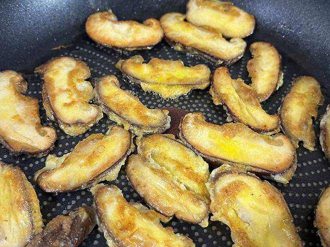 버섯을 계란물에 넣은 다음 계란물을 앞 뒤로 골고루 입혀 줍니다. 버섯은 그냥 굽는 것보다 계란을 묻혀서 구우면 수분이 유지돼 촉촉함이 살아 있습니다.