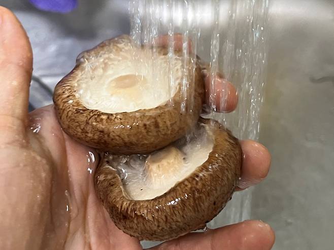 표고버섯은 흐르는 물에 가볍게 세척하세요. 또는 물에 적신 키친타월로 겉 면만 닦아내는 방법도 있습니다.