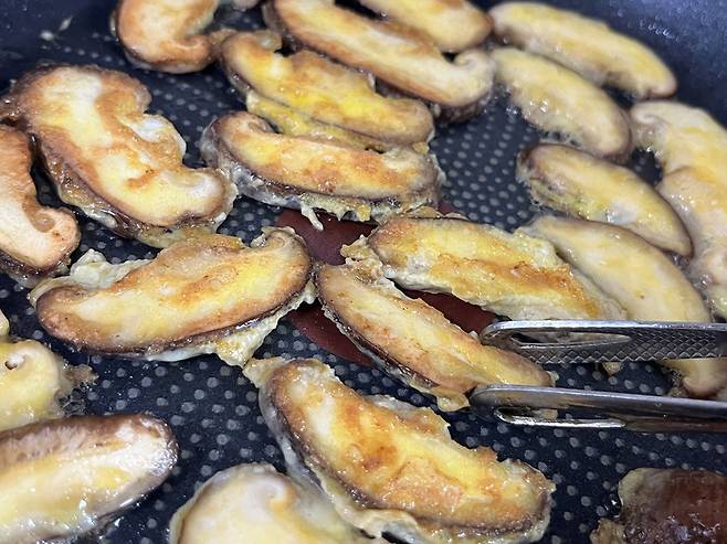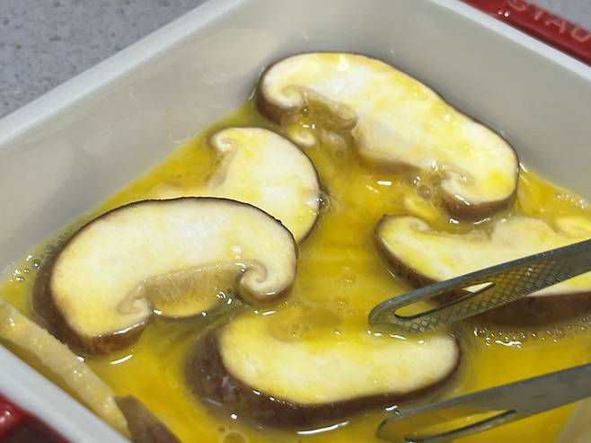 버섯을 계란물에 넣은 다음 계란물을 앞 뒤로 골고루 입혀 줍니다. 버섯은 그냥 굽는 것보다 계란을 묻혀서 구우면 수분이 유지돼 촉촉함이 살아 있습니다.