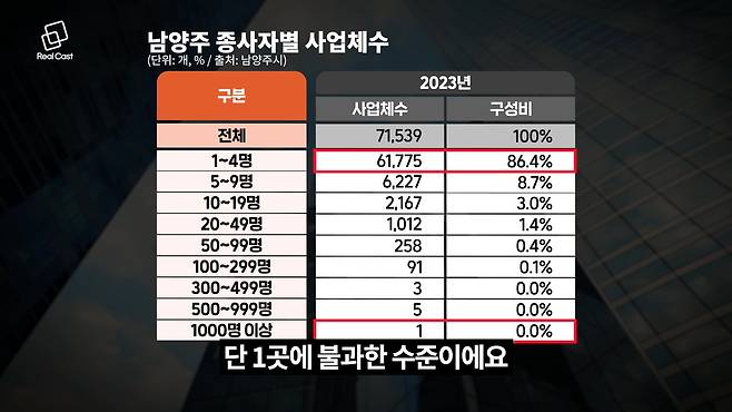 특히 다산신도시의 가장 큰 취약점은 일자리 문제입니다. 사업체 규모를 살펴보면 4인 미만의 영세 사업장이 전체의 86.4%를 차지하고 있으며, 1,000명 이상의 대기업은 단 1곳에 불과합니다. 제조업 기반이 약하고 소규모 사업장 위주로 구성되어 있어 대부분의 근로자가 서울 등 인접 지역으로 출퇴근하는 베드타운 형태를 띠고 있습니다.