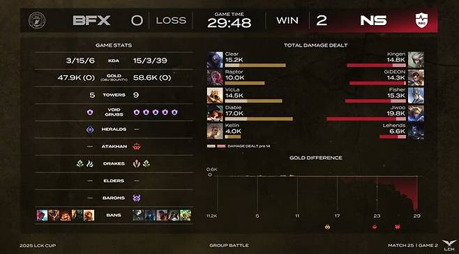 2일 서울 종로 LoL 파크에서 펼쳐진 2025 LoL 챔피언스 코리아 컵 농심 레드포스와 BNK 피어엑스의 대결에서 농심 레드포스가 2:0으로 깔끔하게 승리하며 그룹 배틀 경기를 2승 3패로 마감했다. BNK 피어엑스는 이번 경기도 패배하며 0승 5패로 마무리 지었다.