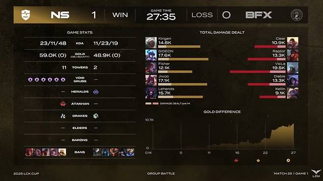 BNK는 바텀 다이브로 3킬을 따냈지만, 이미 미드와 탑은 라인 관리가 되지 않는 상황이라 이득이라고 보긴 어려웠다. 농심은 빠른 시야 장악으로 아타칸까지 사냥한 뒤 오공과 뽀삐를 잡고 21분에 탑 억제기까지 파괴했다. 이후에도 농심은 안정적으로 스노우볼을 잘 굴려 바론을 미끼로 최후 한타까지 승리해 먼저 1승을 차지했다.