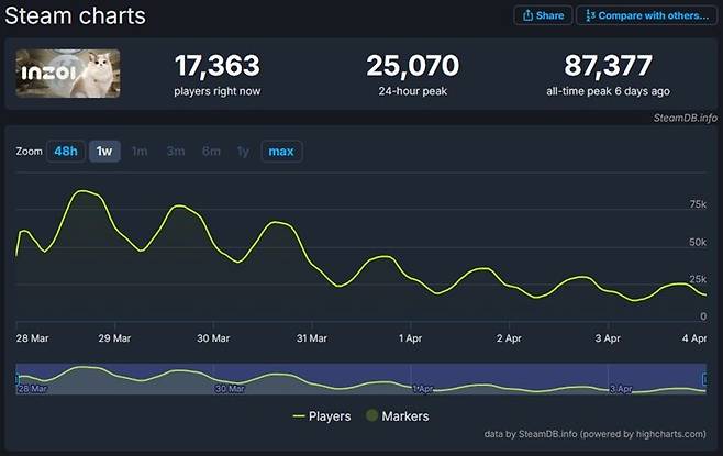 스팀 최고 동접 8만 명대, 스팀 평가 매우 긍정적(83%)