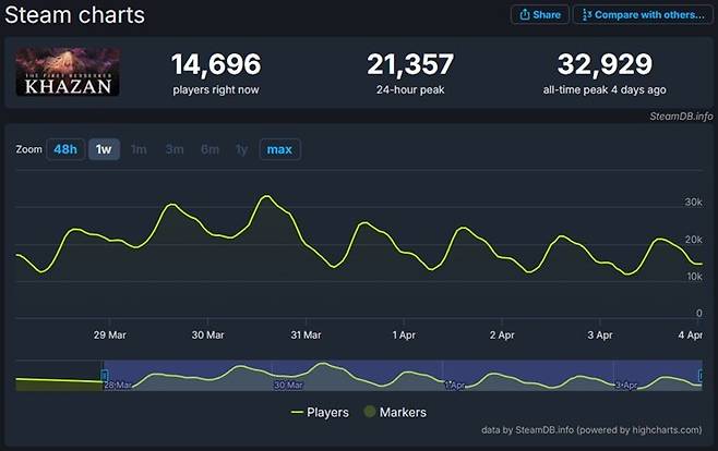 지난 3월 28일 정식 출시된 '퍼스트 버서커: 카잔'이 스팀에서 쾌조의 출발을 보이고 있다. 출시 직후 최고 동시 접속자 수 32,929명을 기록한 데 이어 현재도 일평균 2만 명대의 안정적인 수치를 유지하며 순항 중이다. 하지만 단순한 동접자 수보다 더 주목해야 할 것은 스팀 유저들의 반응이다.