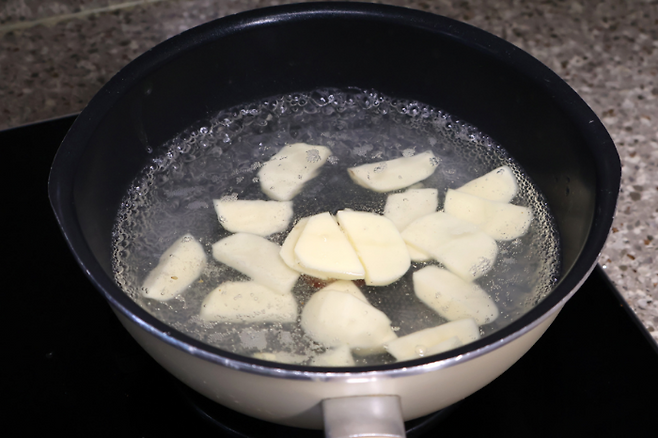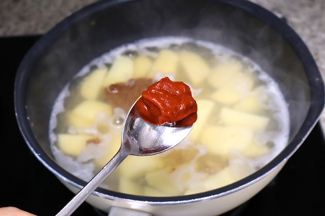 물이 팔팔 끓으면 감자부터 넣어요. 감자가 익는 시간이 가장 오래 걸리기 때문에 시간차를 두고 넣는 거예요.