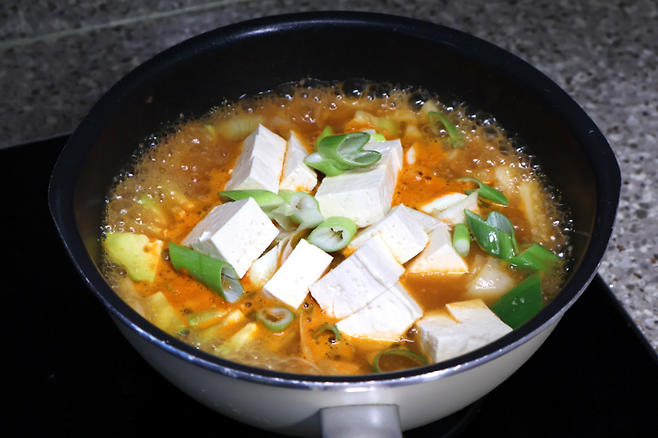 마지막으로 두부와 대파를 넣어요. 보고 국물이 더 빨갛게 되길 원하면 고춧가루를 살짝 더 넣으면 더 맛있어보인답니다. 두부는 다 익은 상태이기 때문에 데워질 정도로만 한소끔 더 끓이면 돼요.