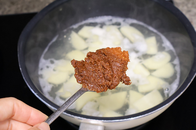 된장찌개 맛있게 끓이는법 중요한 건 물의 양이에요. 처음부터 물이 많으면 졸이는 데 한참 걸리니까 차라리 물이 부족해서 나중에 추가하는 것이 나아요. 저는 보통 350~400ml 정도 잡고 끓입니다.
