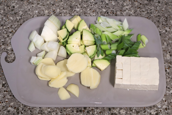 집에 있는 재료들을 다듬었어요. 감자와 양파, 호박, 대파, 그리고 두부 반모면 충분해요. 감자는 너무 두껍지 않게 썰고 호박과 양파 대파는 총총 썰면 됩니다. 두부도 깍뚝썰기 하면 손질은 끝이에요.