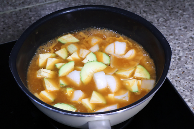 감자가 거의 익으면 호박과 양파를 넣고 끓입니다. 이제 양파와 호박이 익을 때까지 끓이면 돼요.