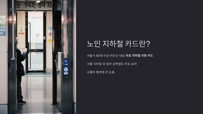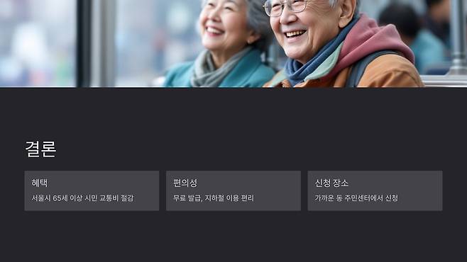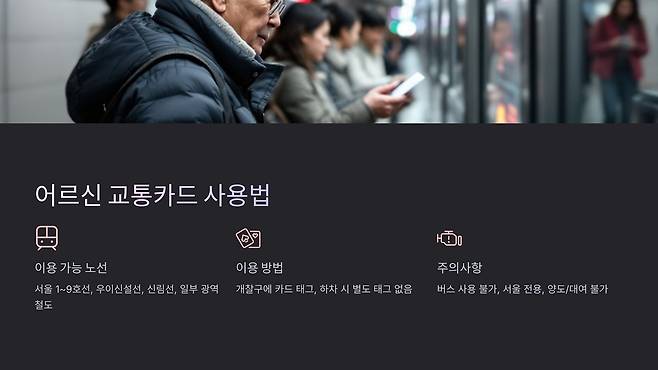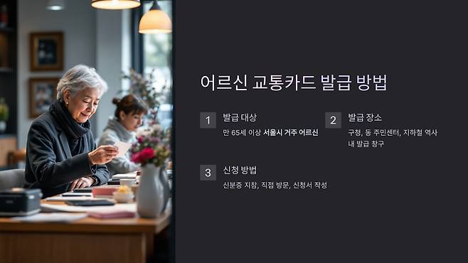 ์์ธ์์์๋ **65์ธ ์ด์ ์ด๋ฅด์ ์ ๋์์ผ๋ก ๋ฌด๋ฃ ์งํ์ฒ ์ด์ฉ์ด ๊ฐ๋ฅํ โ์ด๋ฅด์ ๊ตํต์นด๋โ**๋ฅผ ์ ๊ณตํ๊ณ ์์ต๋๋ค. ์ด ์นด๋๋ ์์ธ ์งํ์ฒ ๋ฐ ์ผ๋ถ ๊ด์ญ์ฒ ๋์์ ๋ฌด๋ฃ ์น์ฐจ๊ฐ ๊ฐ๋ฅํ๋ฉฐ, ๊ตํต๋น ์ ์ฝ์ ํฐ ๋์์ด ๋ฉ๋๋ค. ์ด๋ฒ ๊ธ์์๋ ์ด๋ฅด์ ๊ตํต์นด๋ ๋ฐ๊ธ ๋ฐฉ๋ฒ๊ณผ ์ฌ์ฉ๋ฒ์ ์์ธํ ์๋ ค๋๋ฆฌ๊ฒ ์ต๋๋ค. ๐