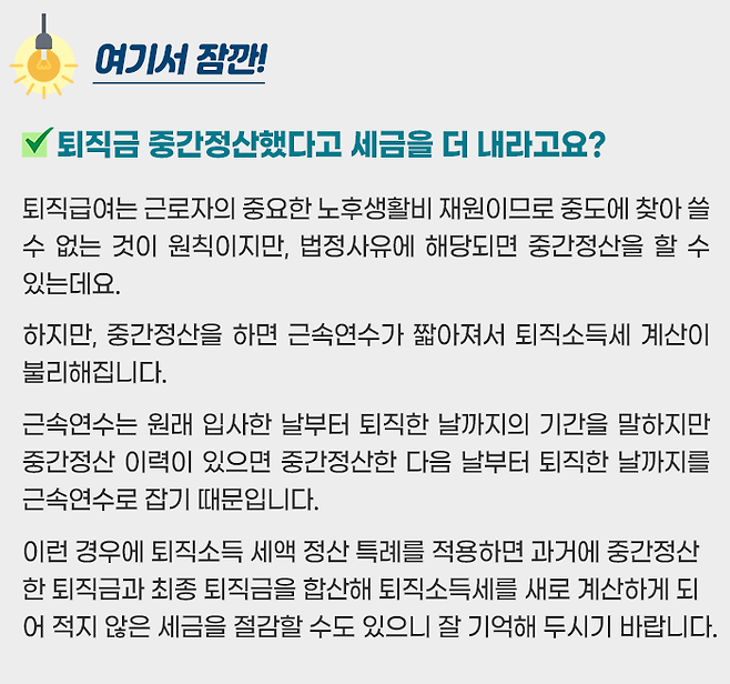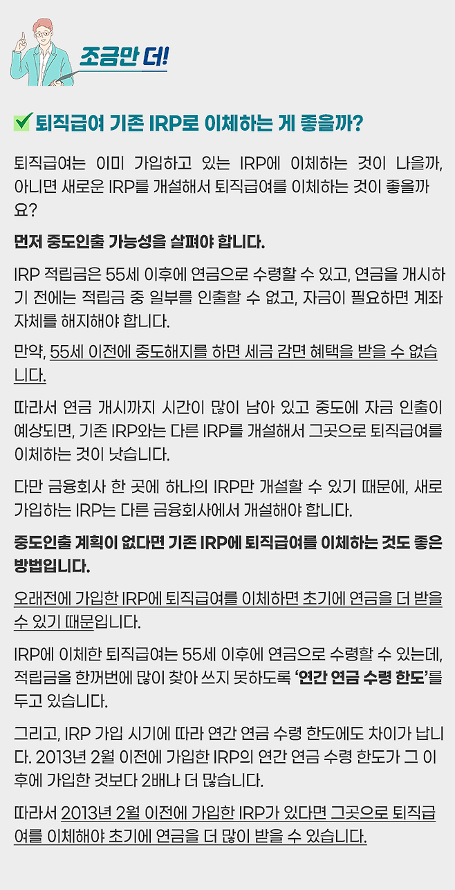 물론, 퇴직연금은 55세부터 받는다고 해서 퇴직소득세가 가중되거나 원래 받아야 할 혜택이 없어지는 것은 아닙니다. 다만, 절세 측면에서 다른 노후대비 소득이 있다면 퇴직연금은 후순위로 미루는 것이 유리하다는 것입니다.