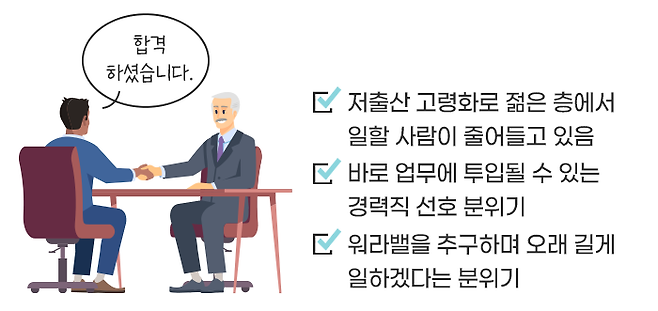 게다가 직장에서도 신입을 채용하기보다 업무에 바로 투입할 수 있는 경력직 채용을 선호하는 분위기가 확산하고 있습니다. 그래서 경력이 있는 사람들은 나이가 좀 있더라도 일할 기회가 많아지고 있습니다.