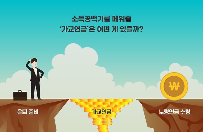 즉, 노령연금 수령 전까지 매월 생활비를 만들어 낼 수 있는 ‘가교(架橋)연금’이 무엇이 있는지를 찾아내는 것이 은퇴 전 반드시 풀어야 할 과제가 된 것입니다.
