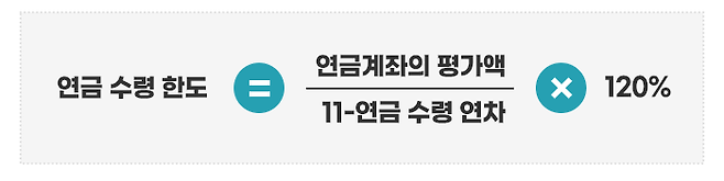 연금 수령 한도란 근로자의 연금 수령 연차에 따라 연금계좌에 있는 금액 중 최대로 인출할 수 있는 한도를 의미합니다. 즉, 세제 혜택을 주는 대신, 한 번에 많은 금액을 빼 쓰지 못하도록 연금 수령 한도를 두고 있는 것이죠.