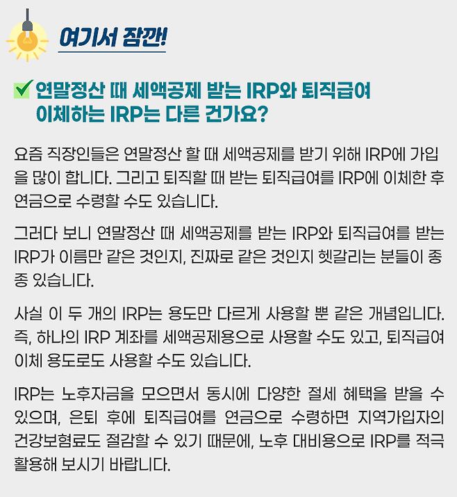 또한, 퇴직급여를 일시에 수령하면 퇴직소득세를 공제하지만 IRP로 이체하면 세금을 떼지 않습니다.