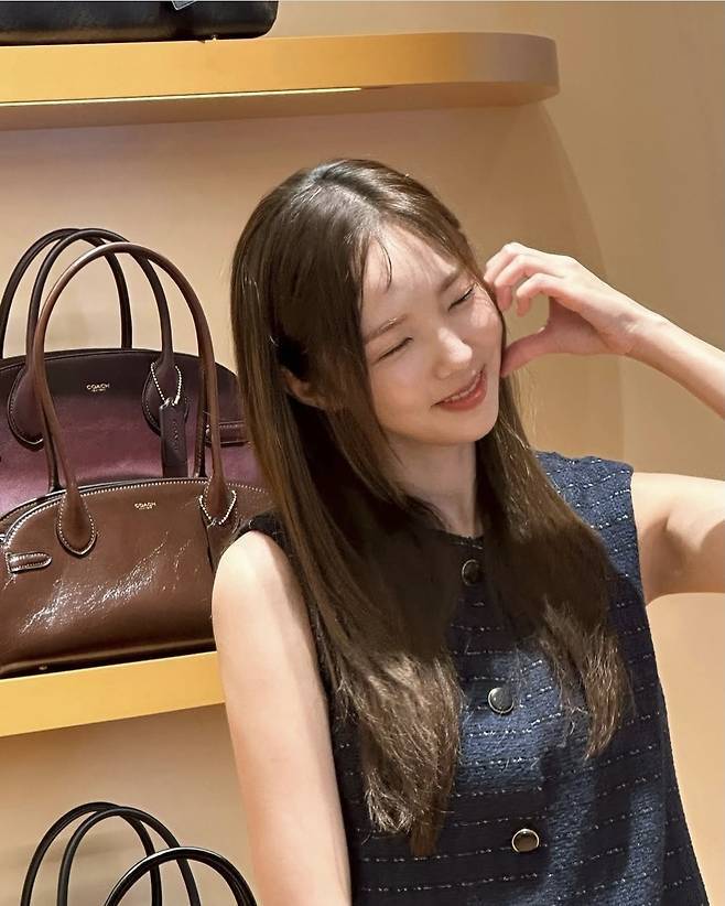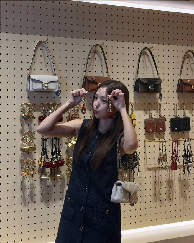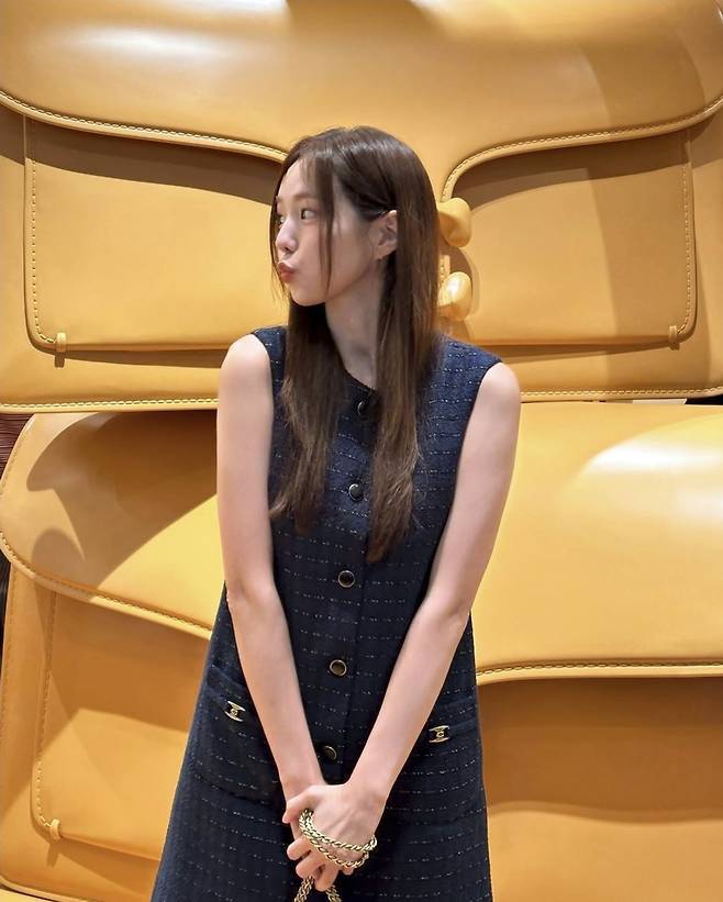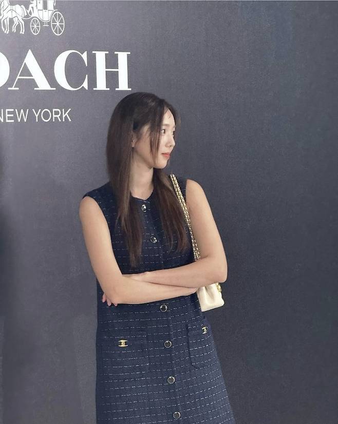 네이비 컬러의 트위드 민소매 원피스를 입고 단아하면서도 도시적인 분위기를 연출했습니다.