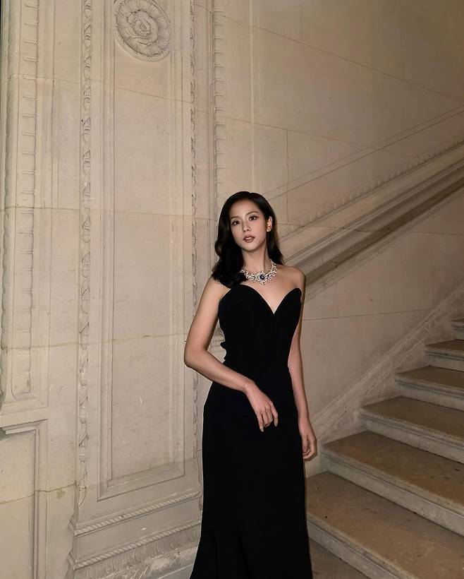 이날 지수는 배우 젬마 찬(Gemma Chan), 안나 사웨이(Anna Sawai) 등 까르띠에 메종의 앰버서더들과 함께 레드 카펫에 올라 우아한 모습을 자랑했다.