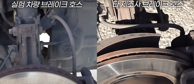 혹시 몰라서 다른 제조사 차량들의 브레이크 호스 위치 또한 확인해 보니 오히려 더 마찰되기 어려운 구조였습니다. 차량의 상태, 제품의 상태, 주변 환경에 의해 만에 하나 마찰될 수도 있겠지만 일반적인 상황에서는 거의 희박하다는 모습이었습니다.