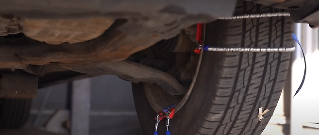 그래서 오늘은 주행 중 브레이크 호스가 스노우 체인과 마찰에 의해 절단이 될 수 있는지, 절단이 된다면 어떻게 얼마나 절단이 될지 직접 실험을 해보기로 결정하였습니다. 뉴스에서 나온 동일한 스노우 체인을 구입하였으며 차량 또한 사고를 당한 동일한 제조사의 차량을 준비했습니다.