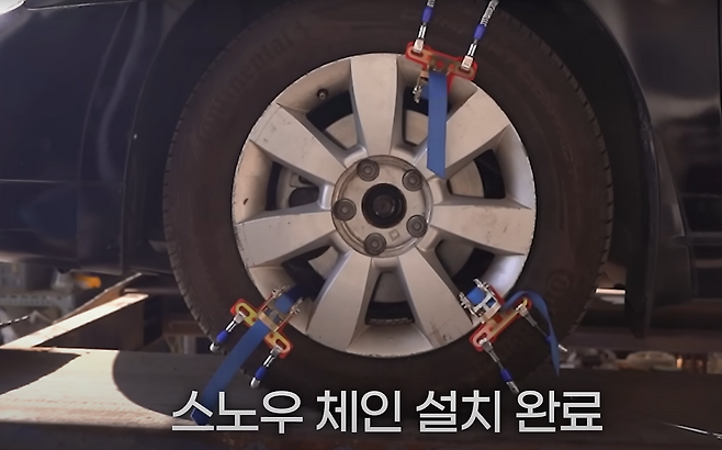 장착하는 방식은 벨트식 스노우체인을 휠 스포크 사이에 껴서 타이어를 고정시켜 사용하는 방식입니다.